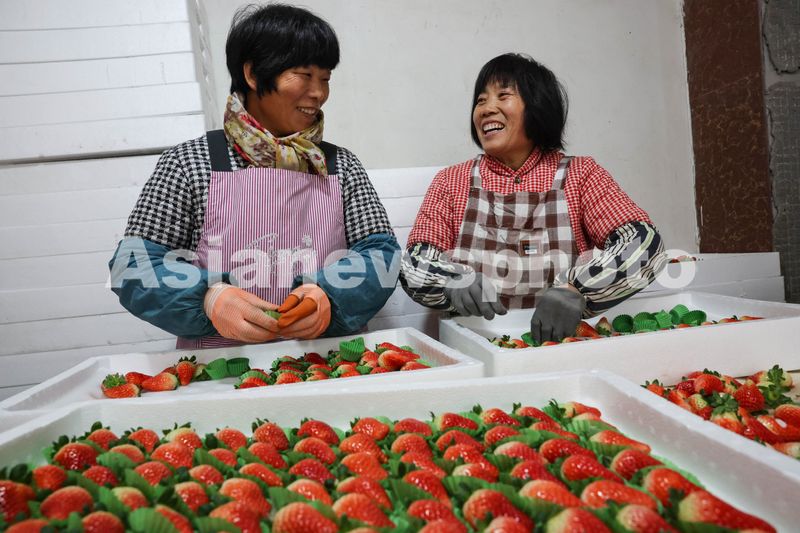 图片说明:2024年12月10日,山东省临沂市郯城县港上镇农户正在将刚刚采摘的草莓进行精选和包装。