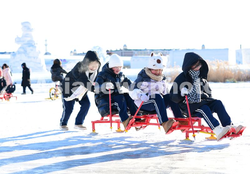 2024年12月12日,游客在满洲里“冰雪童谣”主题乐园体验趣味冰雪运动。