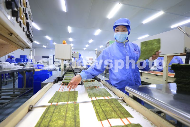 图片说明:2024年12月13日,江苏省连云港市赣榆区海头镇一家紫菜加工企业员工在生产紫菜产品,一片繁忙景象。