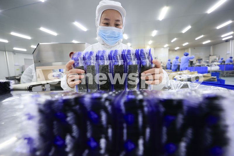 图片说明:2024年12月13日,江苏省连云港市赣榆区海头镇一家紫菜加工企业员工在生产紫菜产品,一片繁忙景象。