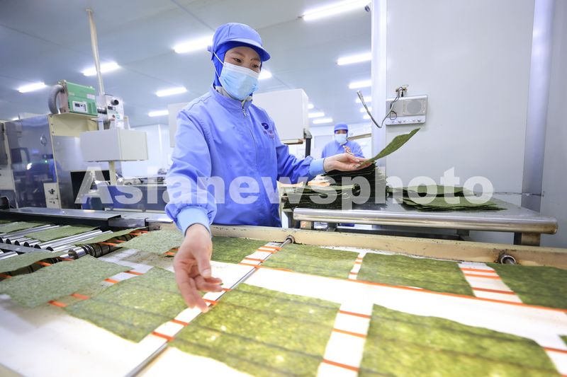 图片说明:2024年12月13日,江苏省连云港市赣榆区海头镇一家紫菜加工企业员工在生产紫菜产品,一片繁忙景象。