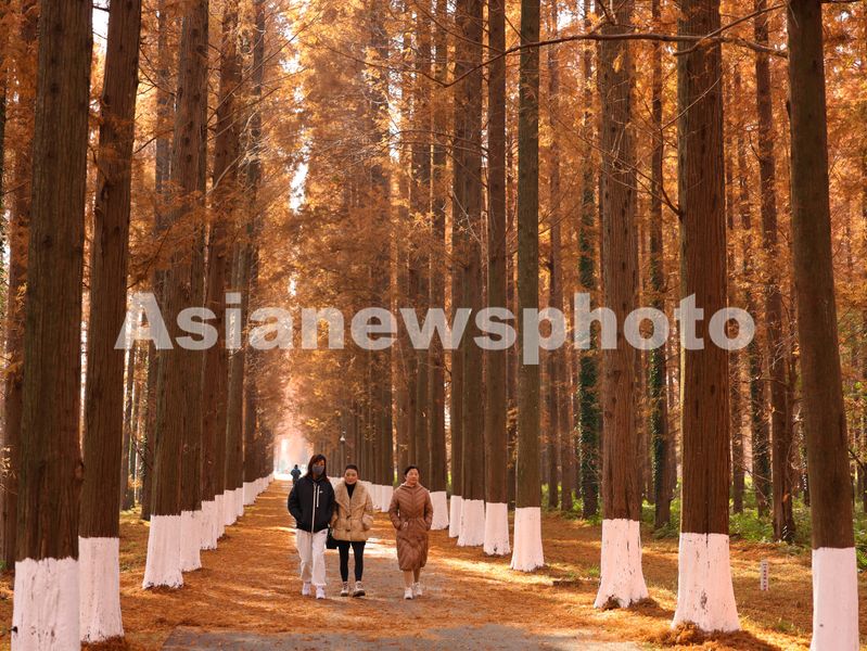 图片说明:12月14日,江苏省盐城市东台市,游客在黄海国家森林公园中游玩、赏景。