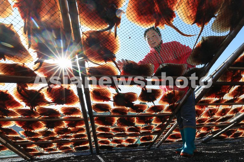 图片说明:2024年12月14日,江苏省连云港市赣榆区柘汪镇马站村渔民在晾晒鱼干。