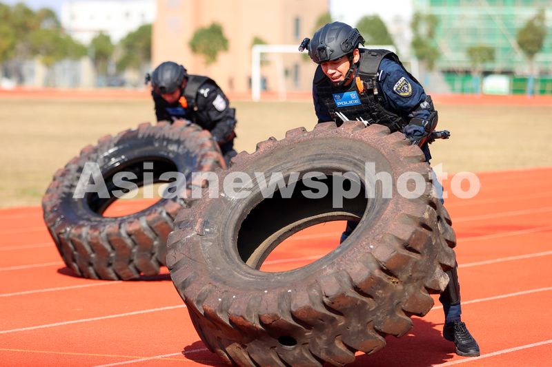 图片说明:2024年12月16日,浙江省舟山市公安局巡特警支队队员正在开展翻轮胎训练。