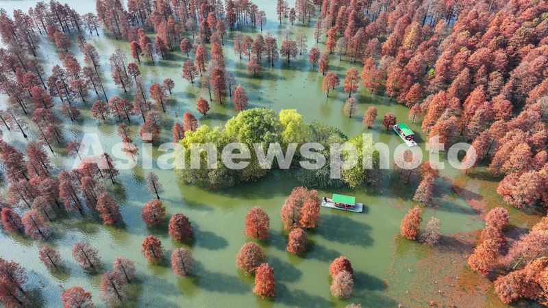 2024年12月13日,在安徽省合肥市庐江县柯坦镇城池村大汉塘,数千株池杉树树叶正渐次变红,绘就冬日最美画卷,游客泛舟其中,如入仙境。