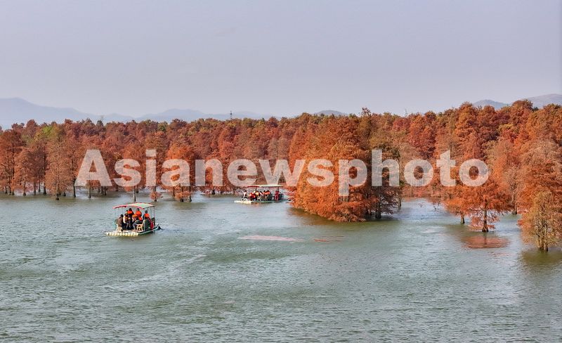 2024年12月13日,在安徽省合肥市庐江县柯坦镇城池村大汉塘,数千株池杉树树叶正渐次变红,绘就冬日最美画卷,游客泛舟其中,如入仙境。