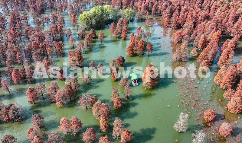 2024年12月13日,在安徽省合肥市庐江县柯坦镇城池村大汉塘,数千株池杉树树叶正渐次变红,绘就冬日最美画卷,游客泛舟其中,如入仙境。
