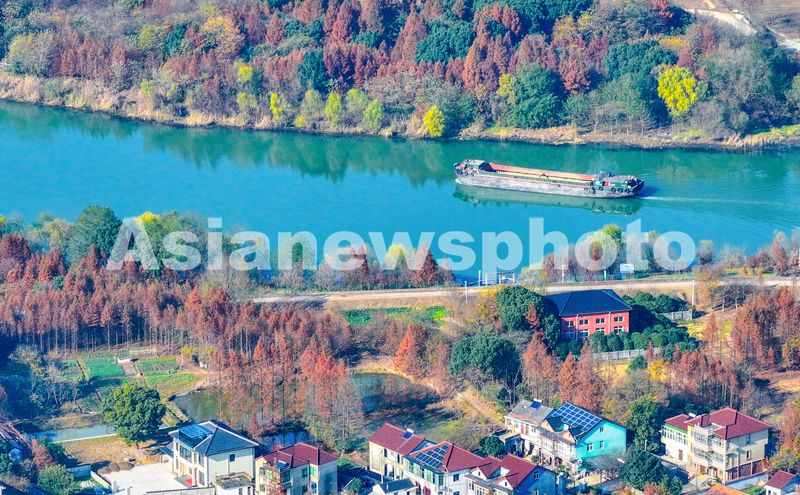 2024年12月16日,长湖申航道浙江长兴吕山段,航道两边水杉树层林尽染与村舍相映成景,运输的船只来往穿梭,构成一片美丽的风景线。