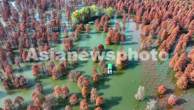 2024年12月13日,在安徽省合肥市庐江县柯坦镇城池村有着上千年历史的大汉塘里,数千株池杉树树叶正渐次变红,绘就冬日最美画卷,空中俯瞰层林尽染、林水交融,游客泛舟其中,如入仙境。