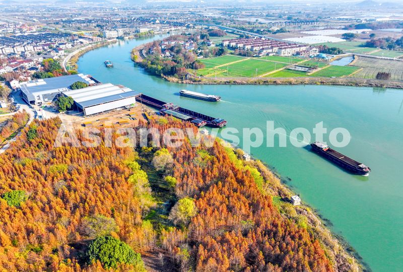 2024年12月16日,长湖申航道浙江长兴吕山段,航道两边水杉树层林尽染与村舍相映成景,运输的船只来往穿梭,构成一片美丽的风景线。长湖申航道作为湖州接轨上海、融入长三角的水运大动脉,承担了该区域大部分的电煤、集装箱、工业原材料、粮食、建材等大宗物资运输,保障长三角地区生产生活和民生需求。