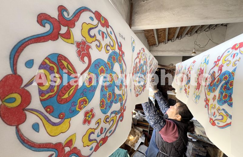 2024年12月16日,在山东省潍坊市寒亭区杨家埠恒兴义画店,年画艺人正在印制蛇年木版年画。由于2025年是农历蛇年,年画艺人们专门设计了蛇年木版年画题材,从绘稿、刻版、印刷等几道工序都一丝不苟,一幅幅工艺精湛、色彩鲜艳、内容丰富的蛇年木版年画呈现在人们眼前,赶在春节前发往全国各地。