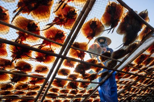 图片说明:2024年12月14日,江苏省连云港市赣榆区柘汪镇马站村渔民在晾晒鱼干。