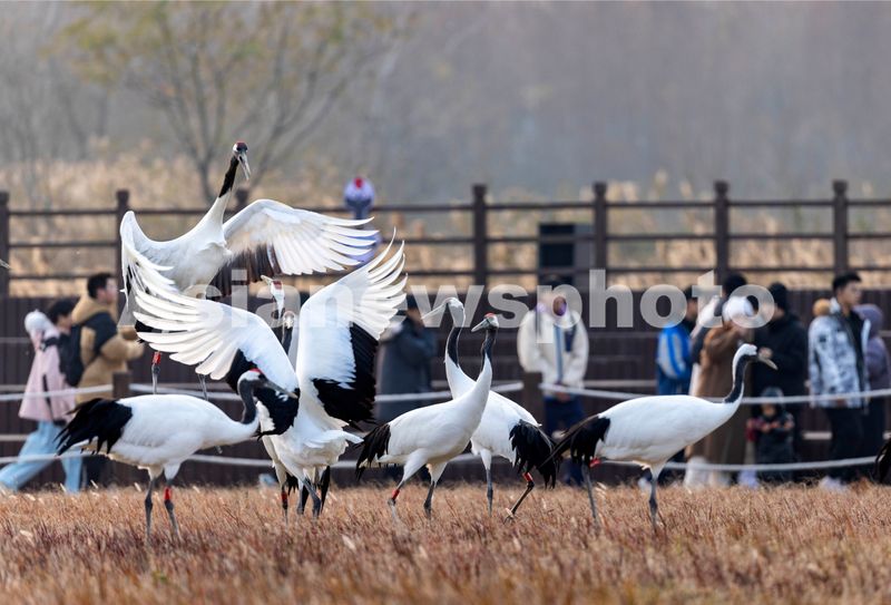 2024年12月13日,游客在江苏盐城湿地珍禽国家级自然保护区观看人工繁育的丹顶鹤练习飞翔。