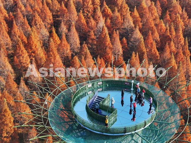 2024年12月14日,江苏省盐城市东台市,游客在黄海国家森林公园中游玩、赏景。仲冬时节,盐城市东台市黄海国家森林公园的水杉林进入最佳观赏期,数万亩水杉林层林尽染,色彩斑斓,景美如画,吸引众多游客观光游览。