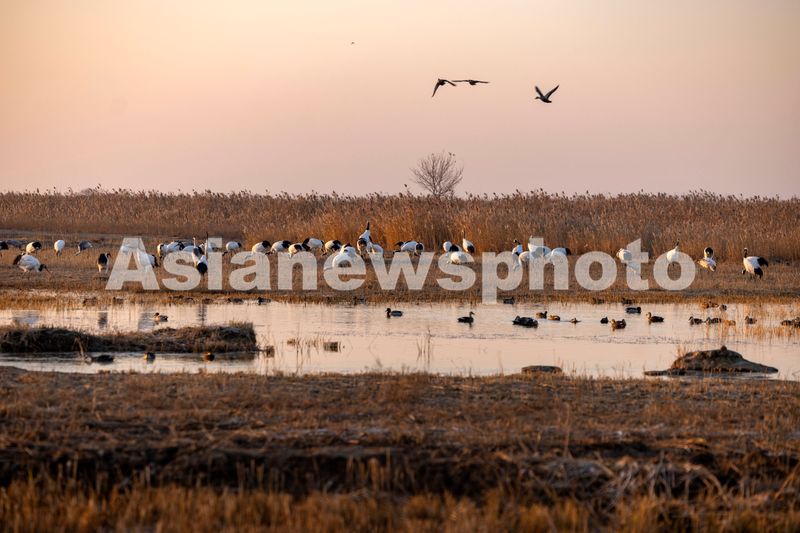 2024年12月15日,丹顶鹤在江苏盐城湿地珍禽国家级自然保护区内觅食。