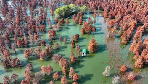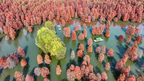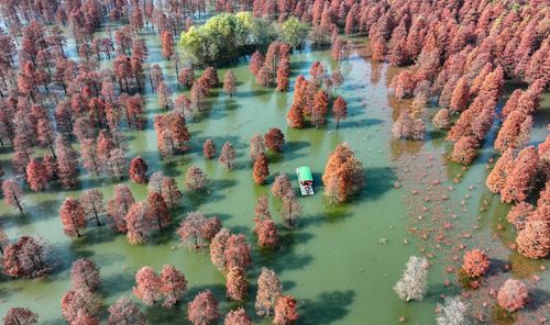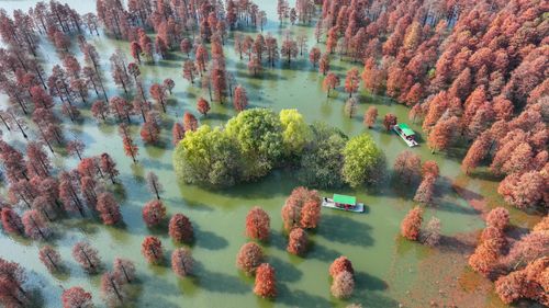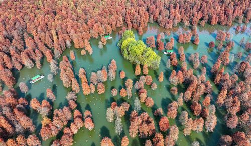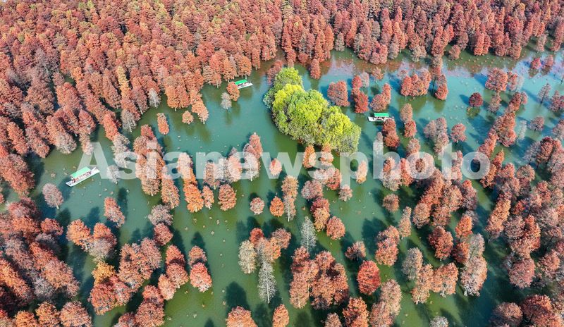 2024年12月13日,在安徽省合肥市庐江县柯坦镇城池村有着上千年历史的大汉塘里,数千株池杉树树叶正渐次变红,绘就冬日最美画卷,空中俯瞰层林尽染、林水交融,游客泛舟其中,如入仙境。