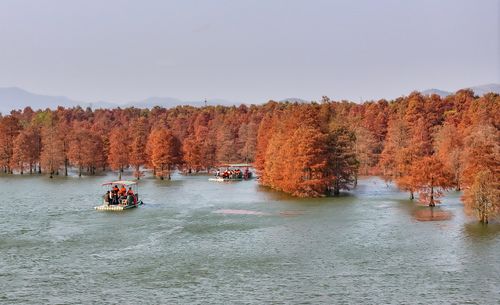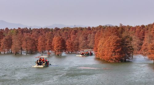 2024年12月13日,在安徽省合肥市庐江县柯坦镇城池村大汉塘,数千株池杉树树叶正渐次变红,绘就冬日最美画卷,游客泛舟其中,如入仙境。