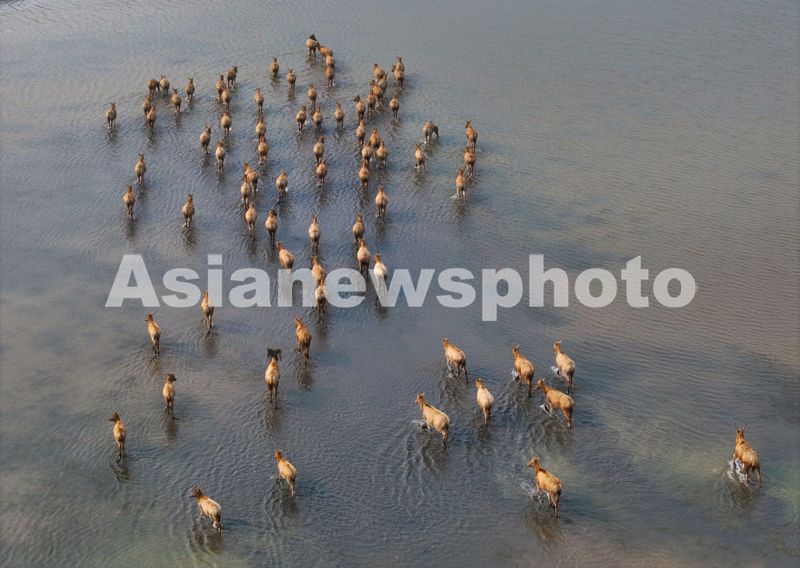 近年来,江苏省盐城市坚定践行“绿水青山就是金山银山”理念,加大滩涂湿地生态修复保护力度,生态环境持续改善,黄海野鹿荡的麋鹿种群保持健康稳定增长,成群的麋鹿嬉戏、觅食,构成一幅美丽的冬日生态画卷。