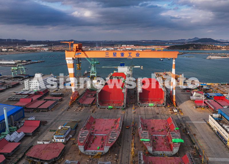 2024年12月17日,在山东省荣成市俚岛镇三星重工业(荣成)有限公司港区,由韩国籍“卡罗湾”轮装运的大型液化天然气运输船(LNG)船段顺利装船发往韩国巨济。