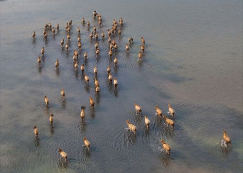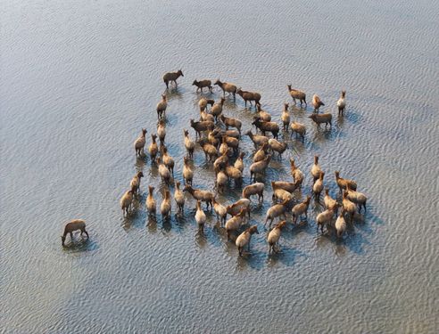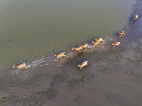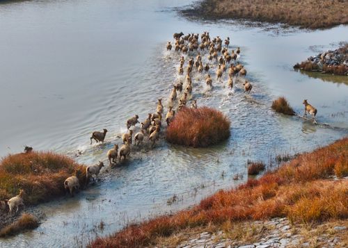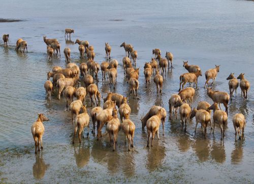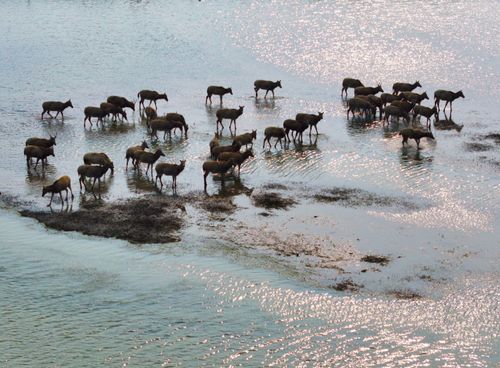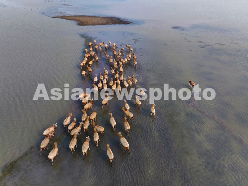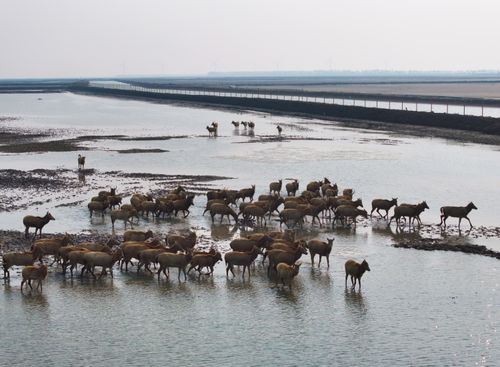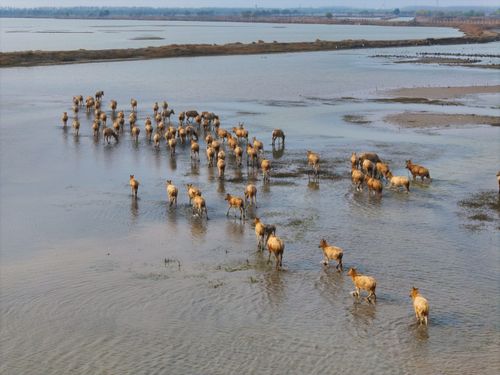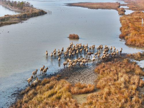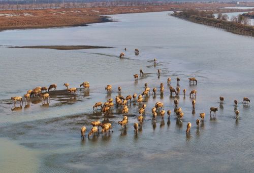 近年来,江苏省盐城市坚定践行“绿水青山就是金山银山”理念,加大滩涂湿地生态修复保护力度,生态环境持续改善,黄海野鹿荡的麋鹿种群保持健康稳定增长,成群的麋鹿嬉戏、觅食,构成一幅美丽的冬日生态画卷。