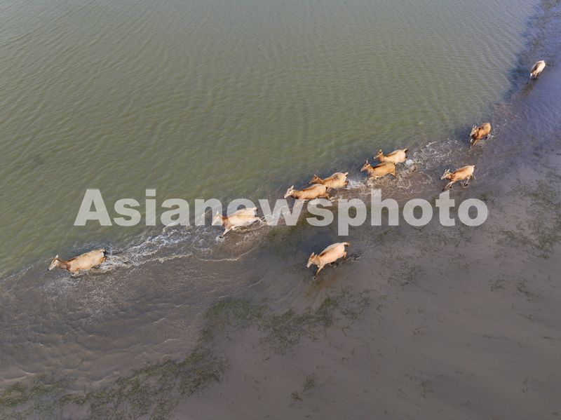 2024年12月13日,江苏省盐城市大丰区,在黄海野鹿荡滩涂湿地,成群麜鹿在嬉戏、觅食。