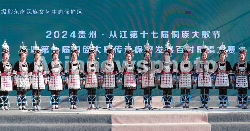 图片说明:2024年12月16日,参赛选手在贵州省从江县侗族大歌百村歌唱大赛活动上演唱侗族大歌。