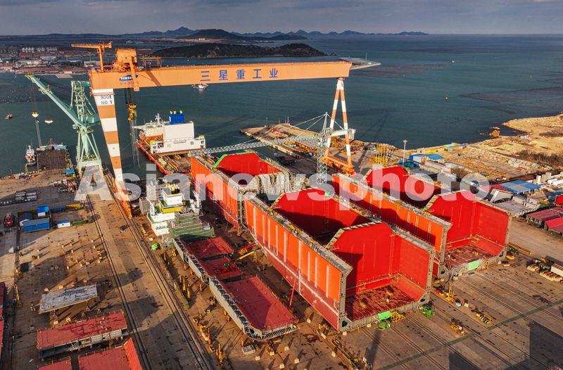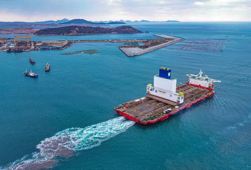 2024年12月17日,在山东省荣成市俚岛镇三星重工业(荣成)有限公司港区,由韩国籍“卡罗湾”轮装运的大型液化天然气运输船(LNG)船段顺利装船发往韩国巨济。