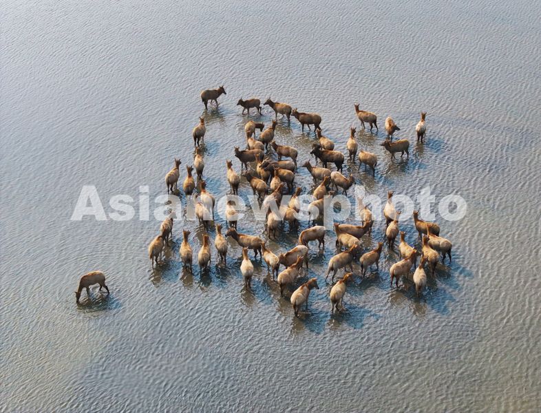 2024年12月13日,江苏省盐城市大丰区,在黄海野鹿荡滩涂湿地,成群麜鹿在嬉戏、觅食。