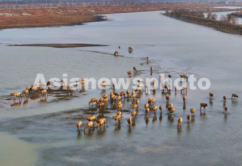 近年来,江苏省盐城市坚定践行“绿水青山就是金山银山”理念,加大滩涂湿地生态修复保护力度,生态环境持续改善,黄海野鹿荡的麋鹿种群保持健康稳定增长,成群的麋鹿嬉戏、觅食,构成一幅美丽的冬日生态画卷。