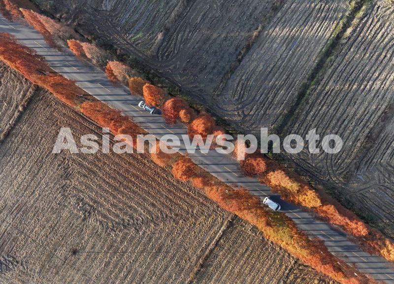 2024年12月16日,空中俯瞰浙江省金华市武义县王宅至岱石乡村公路,种植在两边的水杉行道树叶片金黄,美景如画。