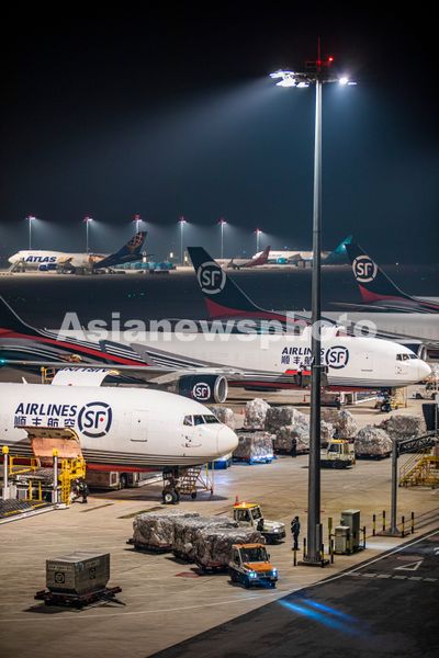 2024年12月12日,湖北鄂州,亚洲第一专用货运机场鄂州花湖机场内一片繁忙,一架接一架专用货机在这里起降,工作人员将一批批货物进行转运装载,保障物流的运行畅通。