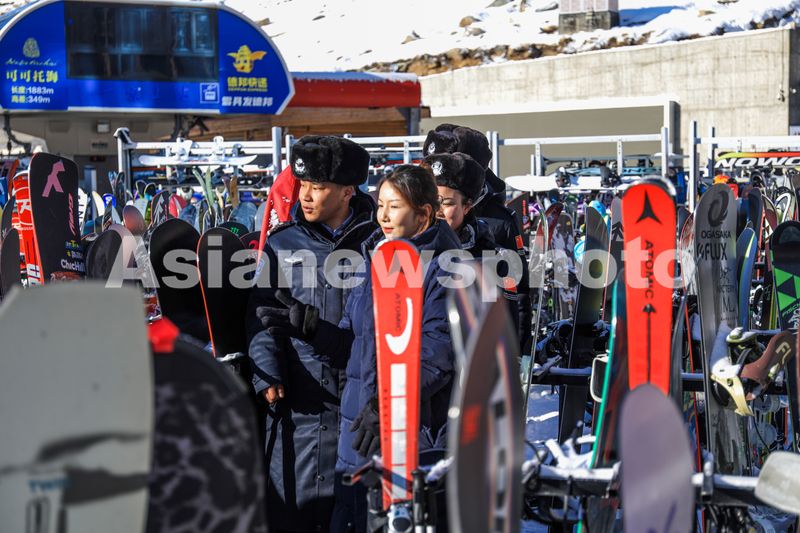 2024年12月17日,吐尔洪边境派出所民警对滑雪场雪板存放处开展安防检查。