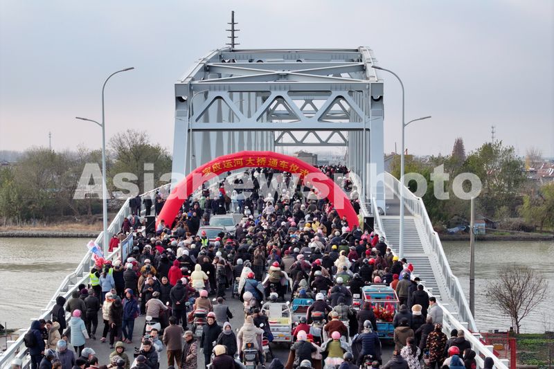 图片说明:2024年12月18日,在江苏省扬州市宝应县宝应运河大桥举行开通仪式上,市民群众前来感受横跨京杭运河宝应运河大桥。
