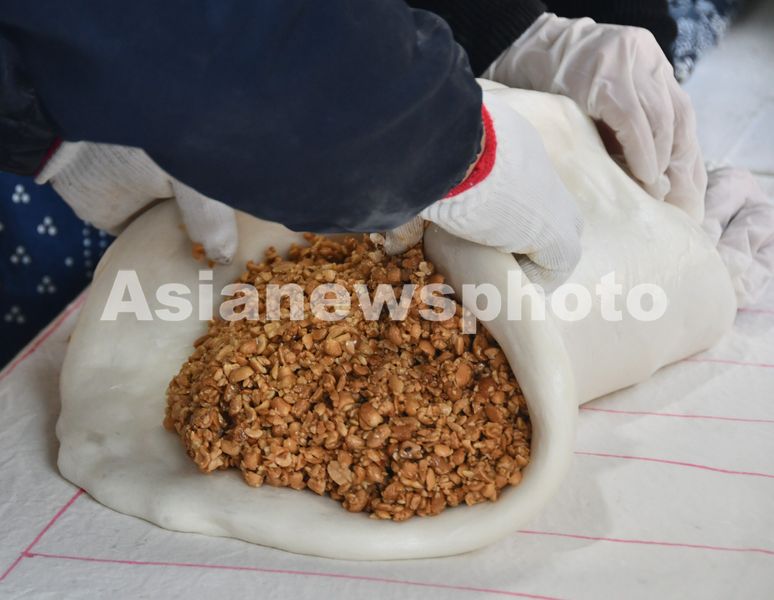 图片说明:12月18日,河北省邯郸市永年区广府镇东街村的村民正在手工制作陈二南糖。