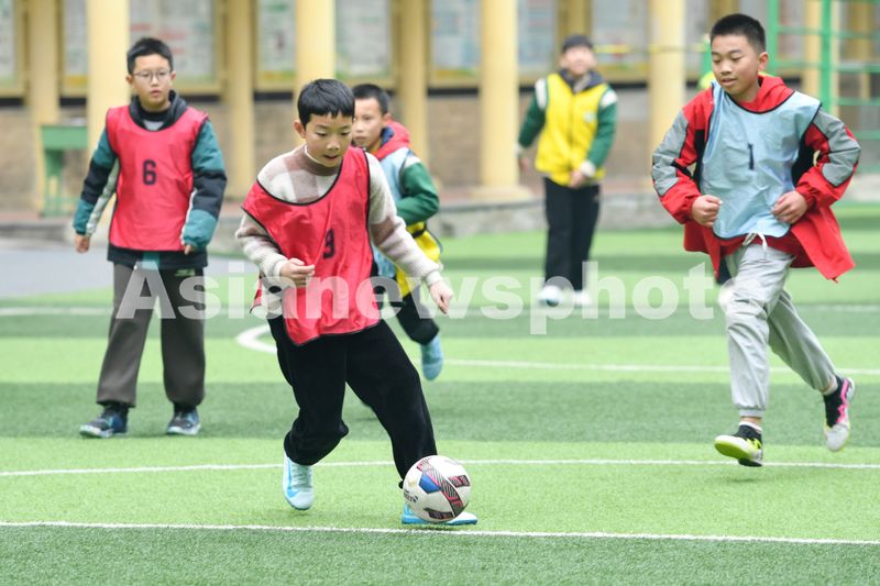 2024年12月18日,在四川省南充市蓬安县实验小学冬季运动会上,学生在进行足球比赛。