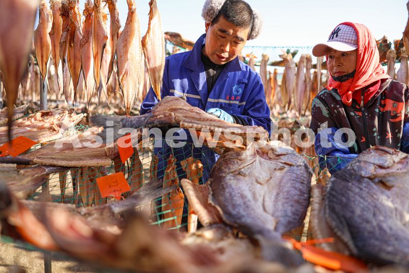 2024年12月19日,山东省荣成市石岛管理区王连街道北桥头村一处渔家小院,农户利用晴好天气,抓紧时间晾晒鱼干,供应市场。当地渔民利用传统工艺制作的“回水鱼干”有上千年历史,被列为省级非物质文化遗产名录。近年来,当地渔民通过网络直播、开网店等渠道,将特色鱼干远销各地。