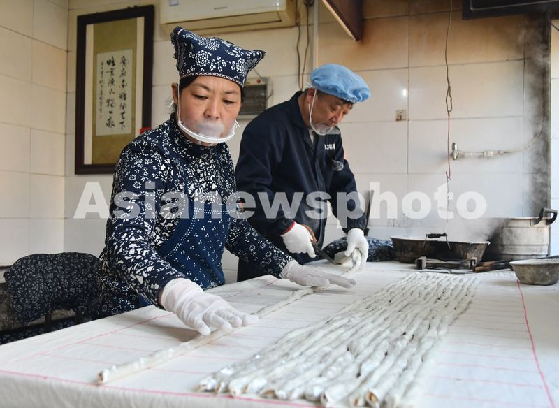 图片说明:12月18日,河北省邯郸市永年区广府镇东街村的村民正在手工制作陈二南糖。