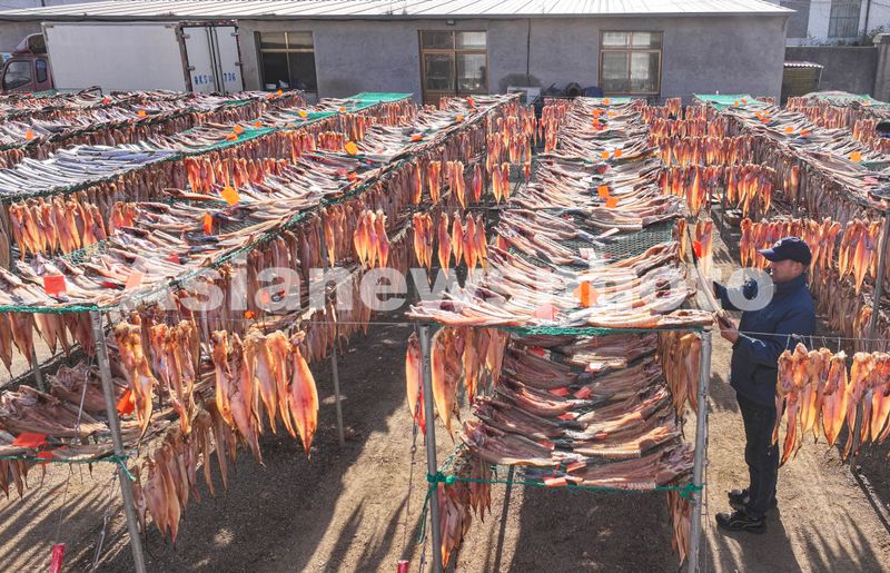 2024年12月19日,山东省荣成市石岛管理区王连街道北桥头村一处渔家小院,农户利用晴好天气,抓紧时间晾晒鱼干,供应市场。当地渔民利用传统工艺制作的“回水鱼干”有上千年历史,被列为省级非物质文化遗产名录。近年来,当地渔民通过网络直播、开网店等渠道,将特色鱼干远销各地。