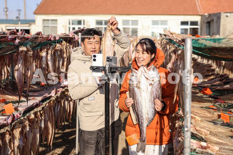 2024年12月19日,山东省荣成市石岛管理区王连街道北桥头村一处渔家小院,电商主播在网络平台销售鱼干。