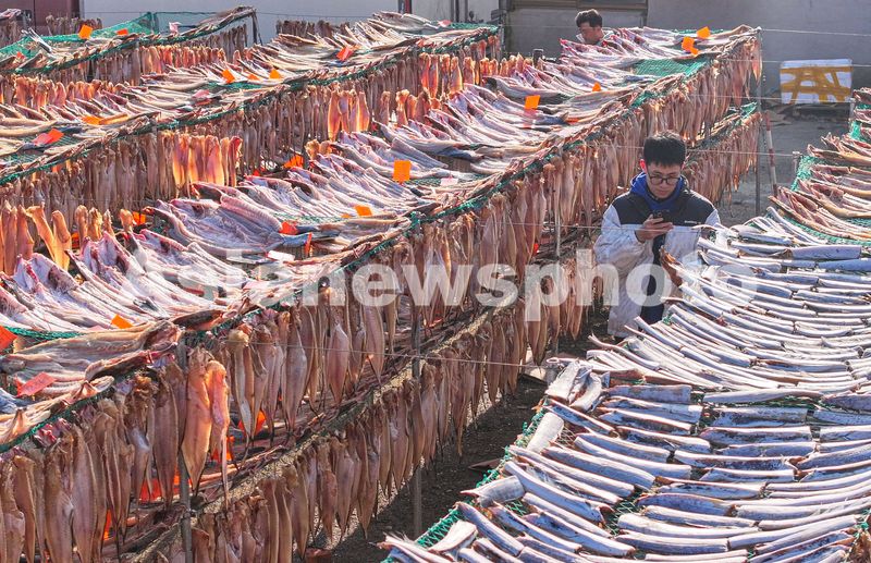 2024年12月19日,山东省荣成市石岛管理区王连街道北桥头村一处渔家小院,农户利用晴好天气,抓紧时间晾晒鱼干,供应市场。当地渔民利用传统工艺制作的“回水鱼干”有上千年历史,被列为省级非物质文化遗产名录。近年来,当地渔民通过网络直播、开网店等渠道,将特色鱼干远销各地。