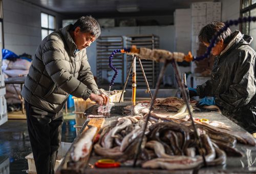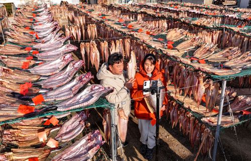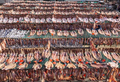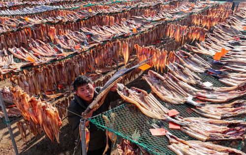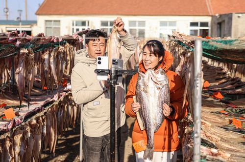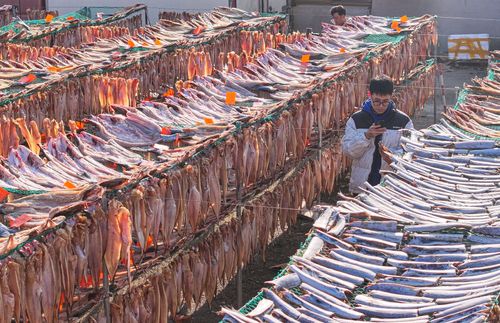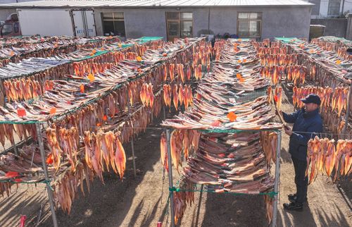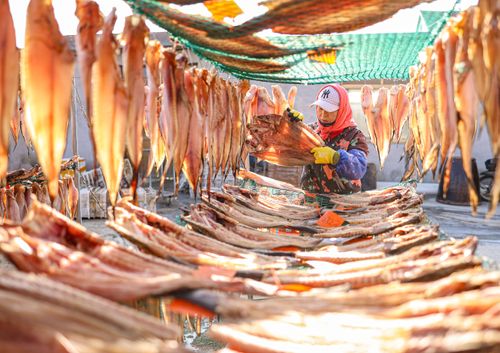 2024年12月19日,山东省荣成市石岛管理区王连街道北桥头村一处渔家小院,农户利用晴好天气,抓紧时间晾晒鱼干,供应市场。当地渔民利用传统工艺制作的“回水鱼干”有上千年历史,被列为省级非物质文化遗产名录。近年来,当地渔民通过网络直播、开网店等渠道,将特色鱼干远销各地。