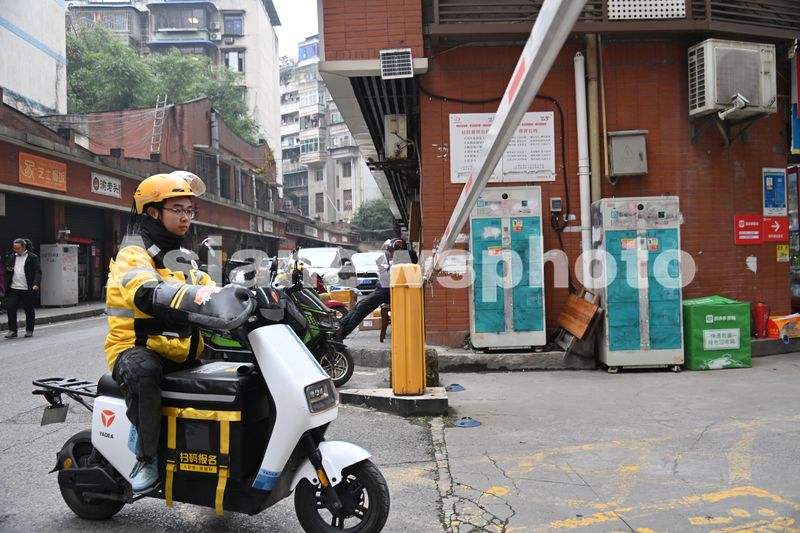2024年12月18日,重庆市沙坪坝区渝碚路街道汉渝路社区,送餐员正在配送。