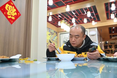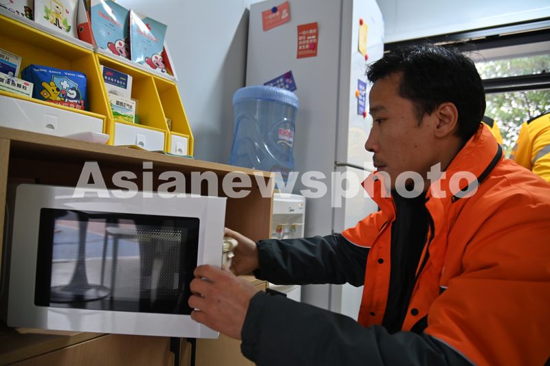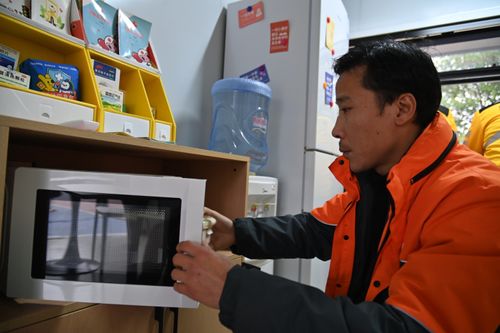 图片说明:2024年12月18日,重庆市沙坪坝区渝碚路街道杨梨路暖新驿站,快递员使用微波炉热饭。
