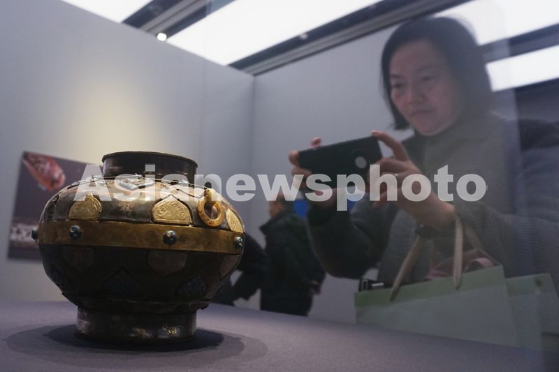 2024年12月19日,观众在良渚博物院观看战国-汉代的嵌玉漆壶。