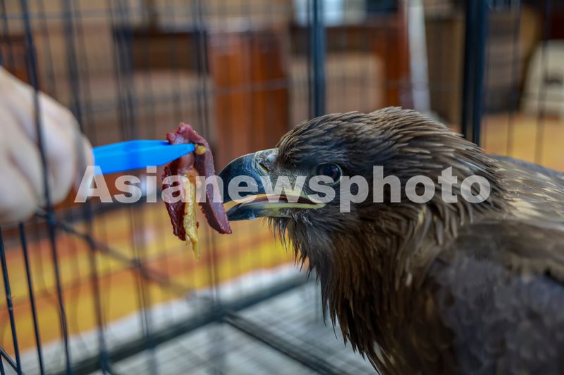 图片说明:2024年12月19日,甘肃省酒泉市金塔县森林资源工作站工作人员正为草原雕喂食观察。