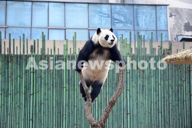 图片说明:2024年12月19日,北京西城区,北京动物园大熊猫馆,大熊猫“福星”爬上一棵Y字形干树桩上,做起“单杠”和“俯卧撑”运动,憨态可掬。