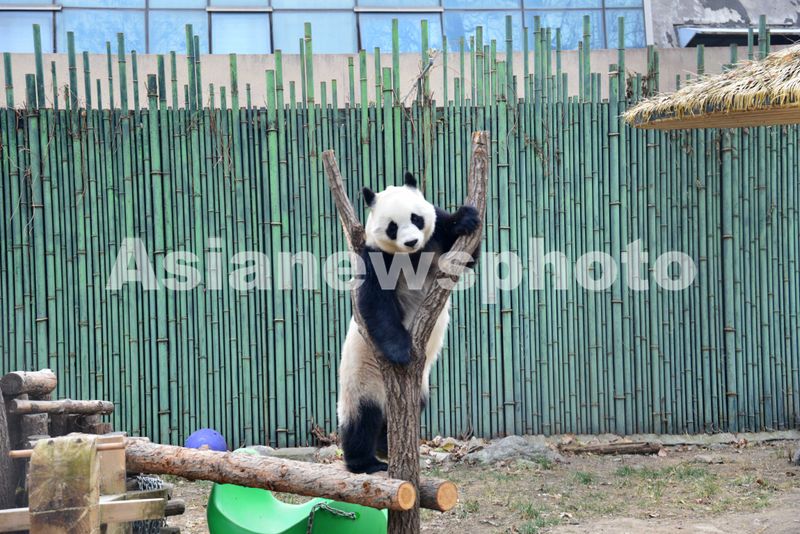 图片说明:2024年12月19日,北京西城区,北京动物园大熊猫馆,大熊猫“福星”爬上一棵Y字形干树桩上,做起“单杠”和“俯卧撑”运动,憨态可掬。