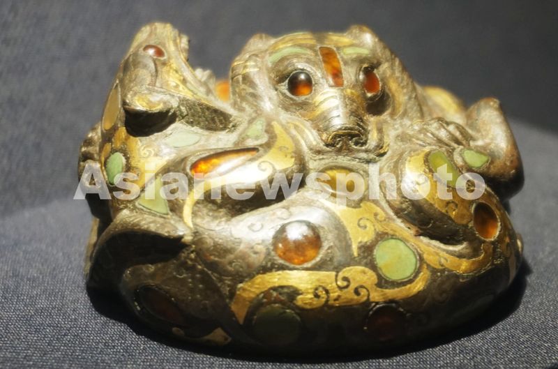 2024年12月19日,在良渚博物院展出的西汉错金银嵌宝石铜镇。