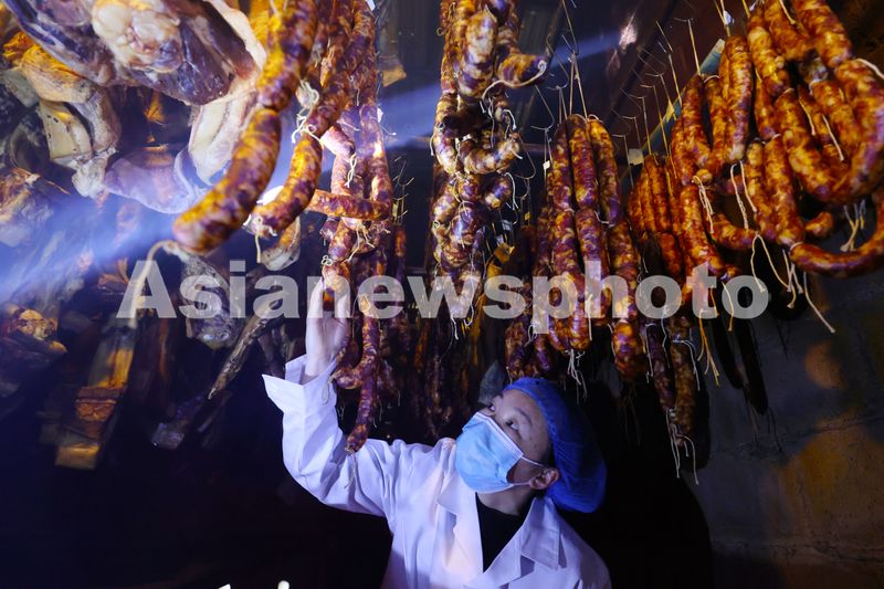 2024年12月22日,重庆市黔江区一食品加工公司工人在生产车间查看腊香肠的晾晒情况。