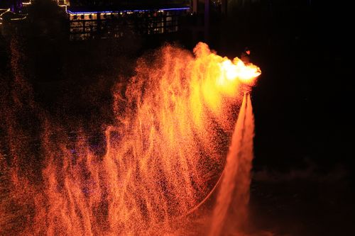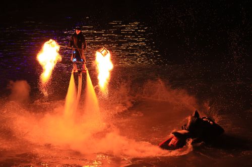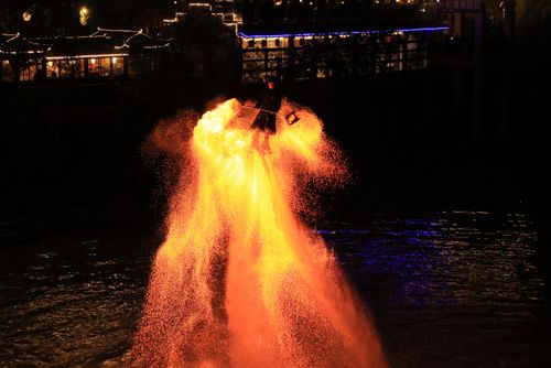 2024年12月19日,浙江省金华市武义县履坦镇叶长埠村武义江上,水上火壶表演震撼上演。